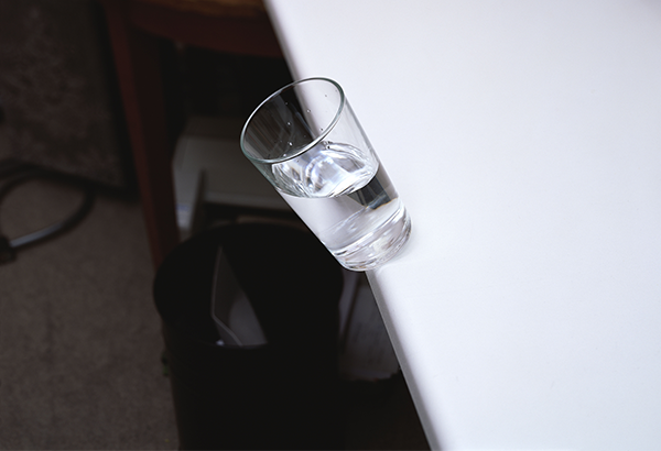The philosophy at the very centre of their work: expect the unexpected. Mid-Air invites visitors into the pair’s history of image-making. The exhibition title perfectly encapsulates the elusive quality of their work, sitting at the transient space between the real and the unreal. In Falling glas, a half-full glass of water teeters on the edge of the desk, a snapshot taken in the milliseconds between order and chaos. A man’s face is constructed amongst the carefully constructed clutter in David wearing bodega Veneta, a playful lesson in the power of perception.