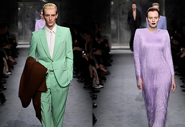 Looks of black leather started off the show — pants, gloves, tailored jackets and more. Silk skirts, sweaters and fringe dresses also made an appearance on the runway. Suits, a long time Tom Ford classic, were probably the most present article of clothing on the runway. Each suit had its own unique look, some featured a more loose fit which showcased Ackermann’s take on the classic Tom Ford suit, and colors and materials varied.